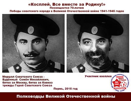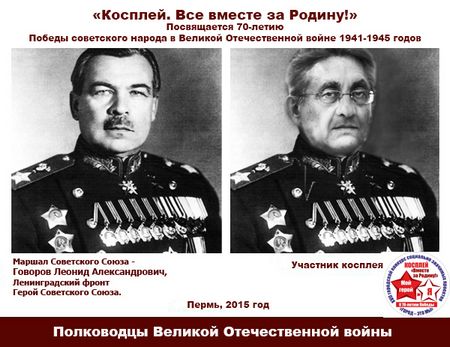 Хотя слово «косплей» в действительности означает точное копирование людьми образов мультипликационных героев (термин имеет японское происхождение), в данном случае никто не стал переодеваться в мундиры времен ВОВ, а просто подвергли фотографии наших современников обработке в графическом редакторе, виртуально преобразив их героев Второй мировой.